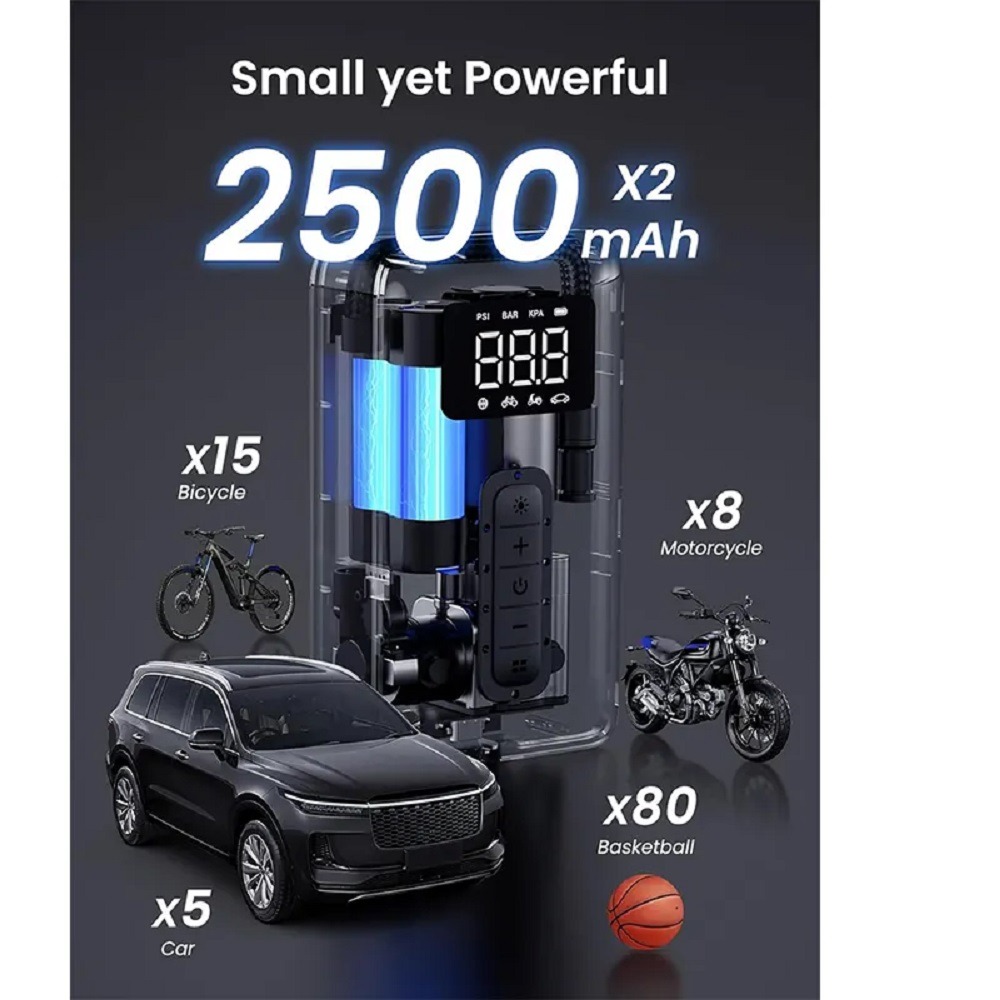 Inflador de neumáticos portátil inalámbrico: con una batería incorporada de 2 x 2500 mAh, el compresor de aire de neumáticos es capaz de proporcionar una potencia excepcional y es muy cómodo de usar. Cuando está completamente cargada, puede inflar alrededor de 12 neumáticos de automóvil pequeños (20-36 PSI).