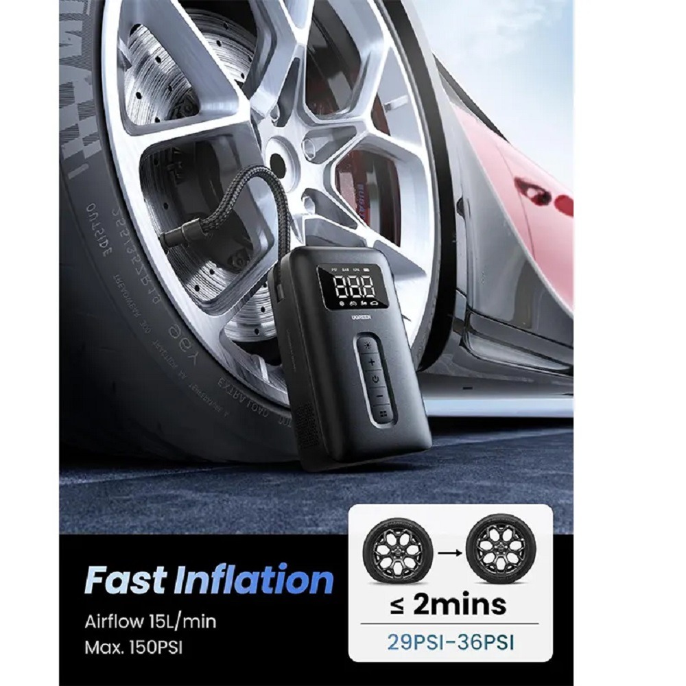 ¿Necesitas inflar rápidamente los neumáticos de tu coche antes de un viaje espontáneo? ¿O tal vez tu bicicleta te llama para que salgas a los senderos del bosque? El compresor de aire Ugreen CD259 te ayudará en cualquier situación, ya que proporciona hasta 150 PSI en un tiempo récord. Su práctico diseño inalámbrico te permite llevarlo a cualquier parte y su potente batería garantiza un funcionamiento duradero. Además, cuenta con una práctica iluminación LED y un apagado automático: nunca tendrás que preocuparte por la sobrecarga o por la incomodidad de bombear en la oscuridad.